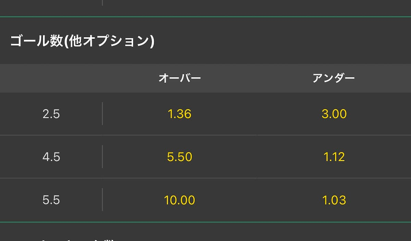 この項目は両チームの得点の合計が何点以上か、または何点以下かというべット項目です。